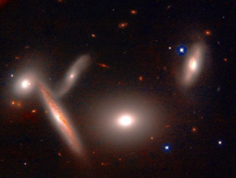 Шесть очень близко расположенных друг к другу галактик, пять из которых - в процессе слияния.
