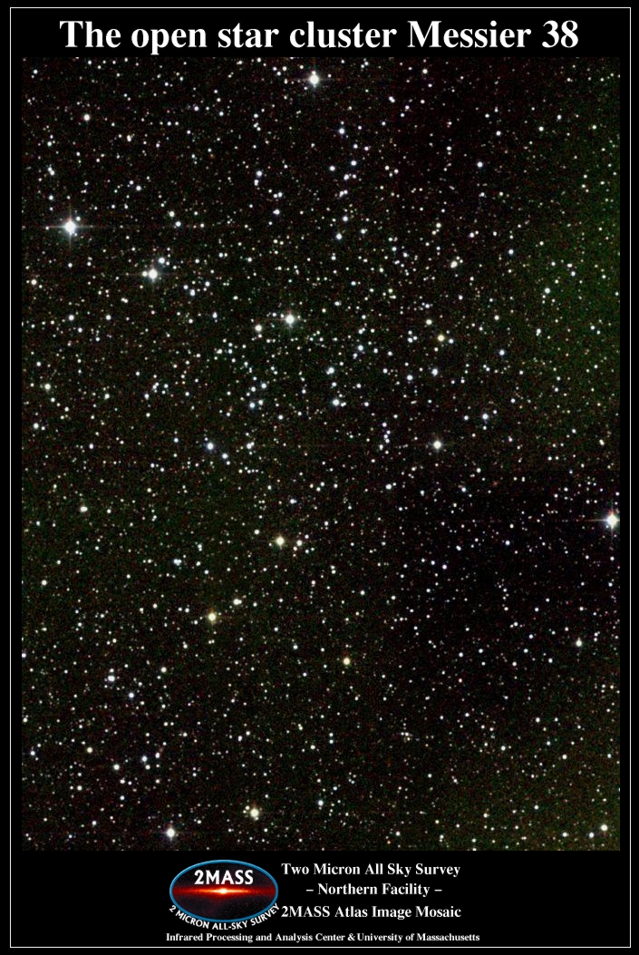... М37 < М38 > М39 ... Рассеянное скопление звёзд М38Рассеянное скопление звёзд M38 или скопление Крест находится в созвездии Возничий (Aur). ![]() Экваториальные координаты (эпоха J2000): Визуальная звёздная величина: 7,0m Обозначение М38 в других каталогах: NGC 1912 Оптимальное увеличение для телескопа при наблюдениях за М38, в зависимости от апертуры телескопа (D), составляет примерно D/6-D/2. Более высокие увеличения конечно добавляют подробности, но ведут к сильному падению яркости изображения, что затрудняет наблюдения. Наилучшим месяцем для наблюдений за М38 является январь. В это время объект находится в полночь вблизи своей наивысшей точки, то есть на него меньше влияют засветка от фонарей и атмосферные искажения.