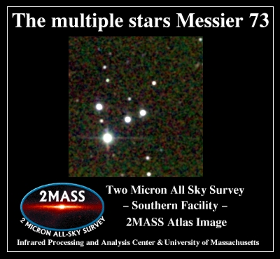 Обозначение М73 в других каталогах: NGC 6994 Оптимальное увеличение для телескопа при наблюдениях за М73, в зависимости от апертуры телескопа (D), составляет примерно >20x. Более высокие увеличения конечно добавляют подробности, но ведут к сильному падению яркости изображения, что затрудняет наблюдения. Наилучшим месяцем для наблюдений за М73 является сентябрь. В это время объект находится в полночь вблизи своей наивысшей точки, то есть на него меньше влияют засветка от фонарей и атмосферные искажения.