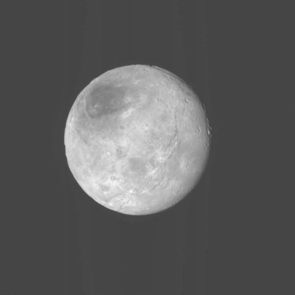 На этом фото на Хароне уже начинают различаться детали, которые были ранее недоступны: один из полюсов этого спутника Плутона оказался окрашен в тёмный цвет.
